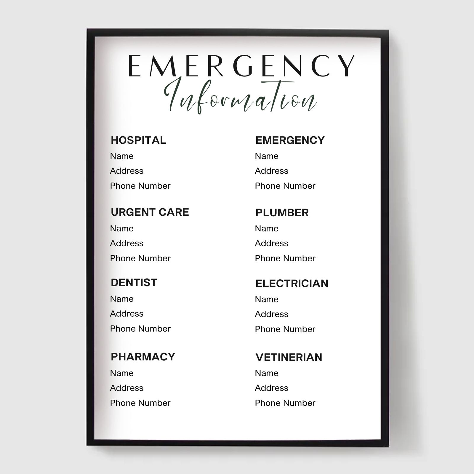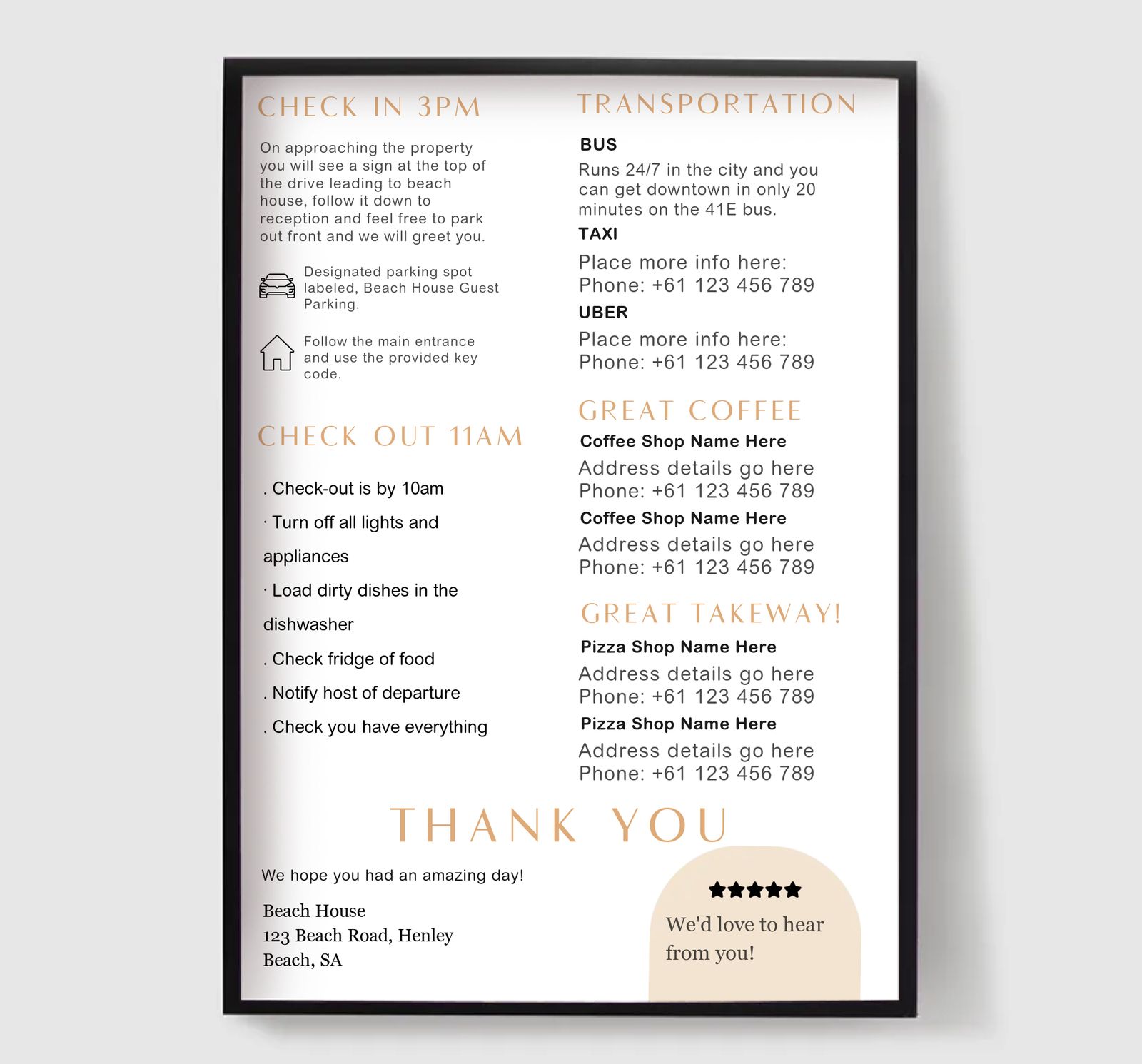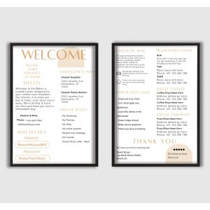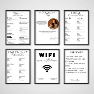 Od znaków WiFi i zasad domowych po instrukcje zameldowania, informacje o sytuacjach awaryjnych i lokalne rekomendacje, nasze plakaty pomagają Ci przekazać wszystko, czego Twoi goście potrzebują - jasno i pięknie. Idealne do stworzenia profesjonalnego, spójnego doświadczenia dla gości, jednocześnie podnosząc standard wnętrza.