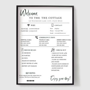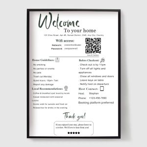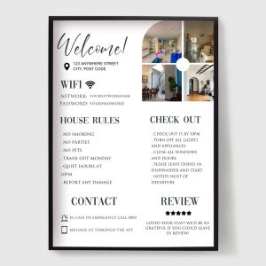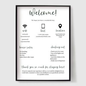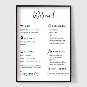 Spraw, aby Twoi goście czuli się mile widziani i dobrze poinformowani dzięki naszej kolekcji plakatów dla pensjonatów i Bed & Breakfast (B&B). Zaprojektowane dla gospodarzy Airbnb, pensjonatów i wynajmowanych na wakacje domów, te druki łączą styl z funkcjonalnością.